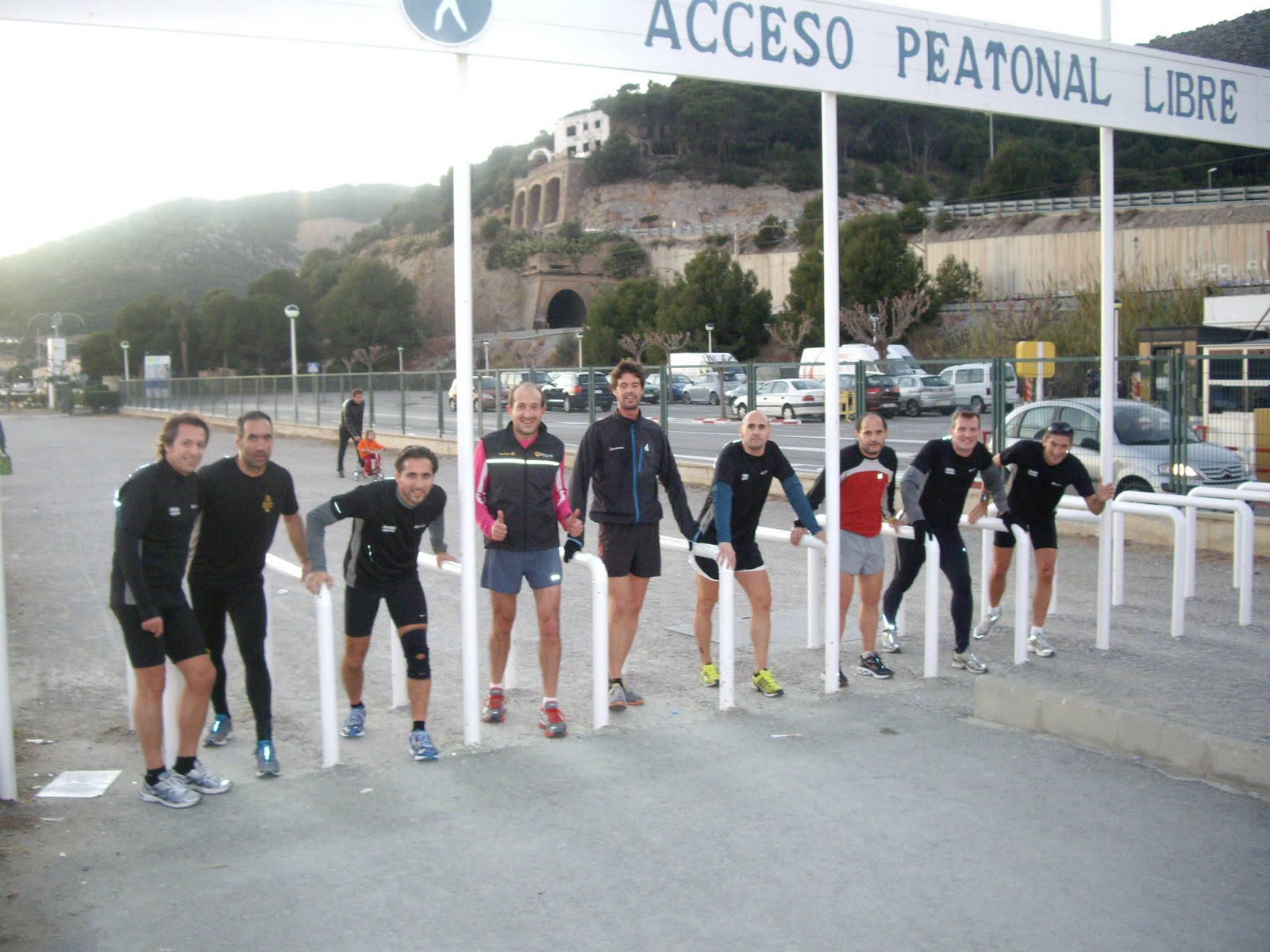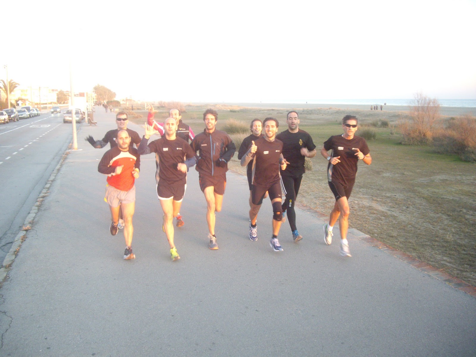 En mi caso, me encargo de capitanear al grupo «avanzado», con el objetivo de completar un buen entreno de rodaje de 16 kms (Áccura-Port Ginesta) a ritmo de 5’/km. Entre pitos y flautas, que si chiste por aquí, broma por allá, nos vamos animando y sin darnos cuenta incrementamos paulatinamente el ritmo inicial previsto y llegamos a Port Ginesta (km8) con unos minutos de margen, momento que aprovechamos para hacernos una foto antes de inciar el camino de vuelta.