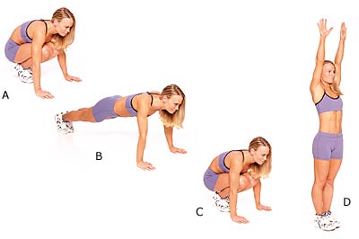 Este es un ejercicio no apto para todos los públicos, ya que requiere un buen dominio de todos los ejercicios por separado. Comenzamos de pie, con los brazos a lo largo del cuerpo y las piernas separadas a la anchura de las caderas. Desde esta posición bajamos haciendo una sentadilla, controlando que la espalda se mantenga recta y estabilizando la postura mediante la contracción del abdomen. Una vez hemos llegado a la posición en cuclillas, realizamos un pequeño salto estirando las piernas hacia atrás y apoyando los brazos delante, y realizamos una flexión de pecho. En la fase de subida de la flexión nos impulsamos con las piernas para recuperar la posición en cuclillas, y desde ahí realizamos un salto vertical, y repetimos todo el proceso.