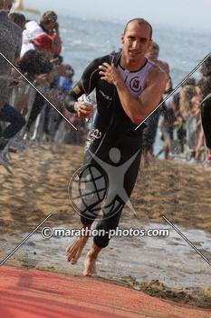 Salgo del agua en 28’59» (parcial 97 de 1400), con excelentes sensaciones, y me dirijo a la T1, que la realizo en unos largos 3’28».