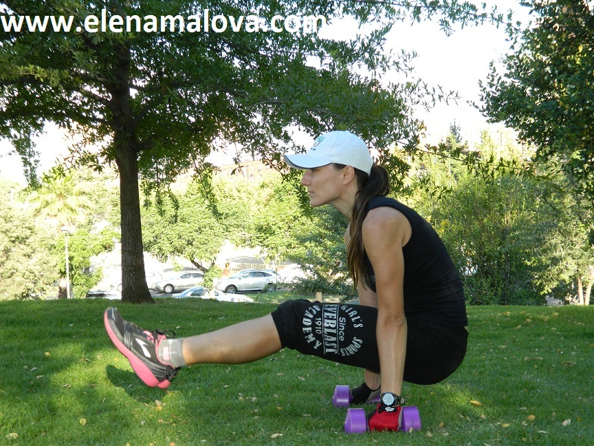 Timer ponemos por 50 seg ejercicio – 10 seg descanso, si eres principiante pon timer por 40/20, será más fácil. Mis mancuernas son de 2.5 kg cada una, total 5 kilos. Esta vez no hacemos circuito, sino tres rondas seguidas de mismo ejercicio, uhoooo 🙂