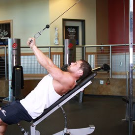 Acuéstese sobre un banco plano inclinado de espaldas a una máquina de polea alta. Sujete la barra por encima de la cabeza, las palmas hacia abajo, agarre estrecho, menos que el ancho del hombro y mantenga los codos pegados a los costados. Los brazos deben crear un ángulo de 25 grados cuando se mide desde el piso. Mantener los brazos fijos, extender los brazos cuando flexiona el tríceps. Exhale durante esta porción del movimiento y mantener la contracción durante un segundo. Poco a poco volver a la posición inicial. Repita el procedimiento para la cantidad recomendada de repeticiones.