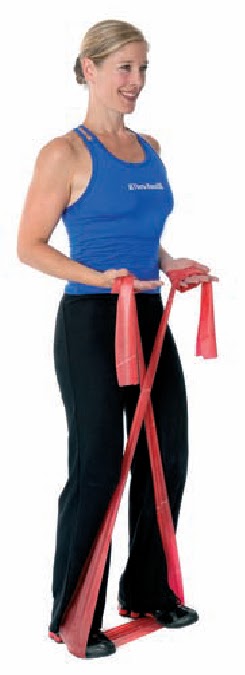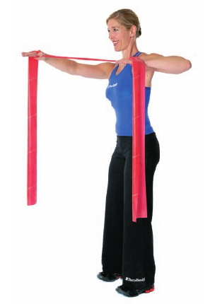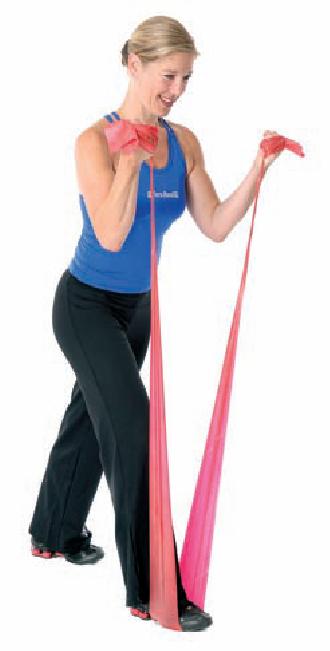 Póngase en el centro de la banda con un pie algo delante del otro. Cruce los extremos de la banda delante del cuerpo. Las palmas hacia arriba, los codos en los lados. Levante los brazos y después lateralmente sobre la cabeza, baje lentamente los brazos.