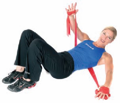 Acuéstese boca arriba con las piernas dobladas (ángulo de 90° entre cadera y rodillas). Enrolle el centro de la banda alrededor de cada pie. Agarre los extremos de la banda y ponga las manos detrás de la cabeza. Levante el tronco ligeramente con los codos mantenidos al lado y bájelo. Ideal para principiantes,