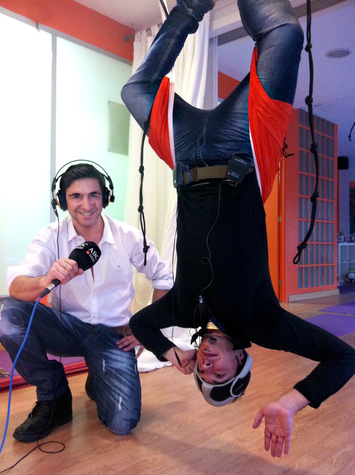 Queremos Hablar» envió una unidad móvil al AeroYoga® Institute para probar en directo que su reportero, Nacho Hernández, era capaz de crecer físicamente gracias a la practica de unos 45 minutos colgado boca abajo en el columpio de AeroYoga®.