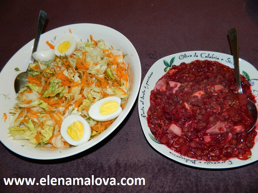 Después en las lentejas agrego papas picaditas, mejor hacerlo un poco más tarde para que papa queda lista pero no como puré 🙂 Y bueno, al final, cuando casi cortamos el fuego juntamos lentejas con mezcla de verduras, agregamos 1-2 dientes de ajo molido y listo! No deja cocinar betarraga con lentejas por mucho tiempo, porque puede perder el color, por eso lo agregamos al final.
