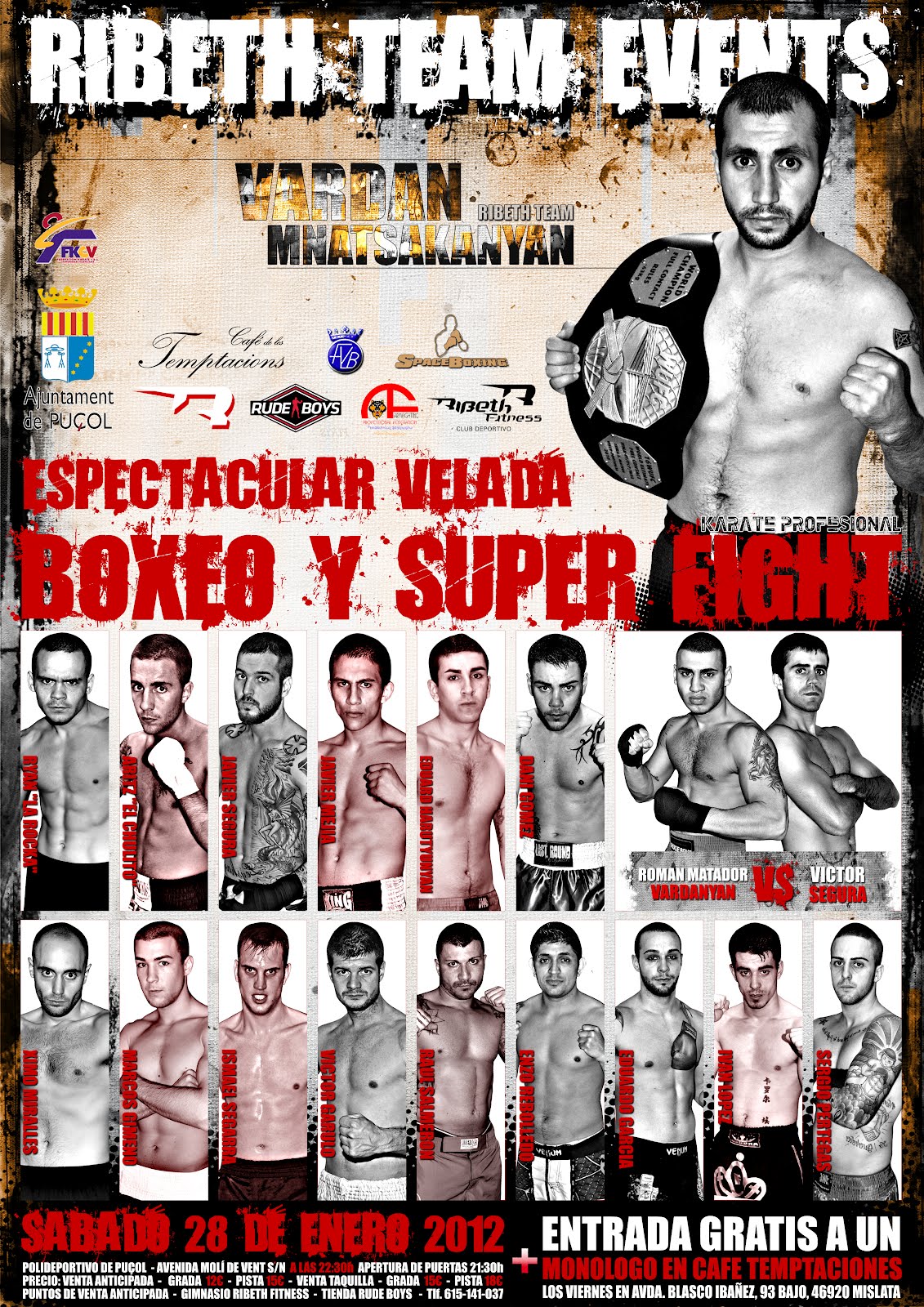 LA VELADA ESPERADA POR TODOS LOS VALENCIANOS A LLEGADO, EL PROXIMO FIN DE SEMANA EN PUÇOL A LAS 21:30 APERTURA DE PUERTAS Y A LAS 22:30H COMIENZA…. EL ESPECTACULO EN RIBETH TEAM EVENTS!!! CUATRO SUPERFIGHT NEOPROFESIONALES + UNA SUPERFIGHT PROFESIONAL SEGUIDO DE CINCO COMBATES DE BOXEO NEOPROFESIONAL + UN COMBATE DE… BOXEO PROFESIONAL!!! INCREIBLE VELADA ORGANIZADA POR RIBETH TEAM EVENTS NO TE LA PUEDES PERDER!! PERO AUN HAY MAS!! CON TU ENTRADA AL EVENTO TIENES ENTRADA GRATUITA A UN MONOLOGO LOS VIERNES EN CAFE DE LAS TEMPTACIONES EN MISLATA!!! NOS VEMOS EN EL RING GUERREROS!!