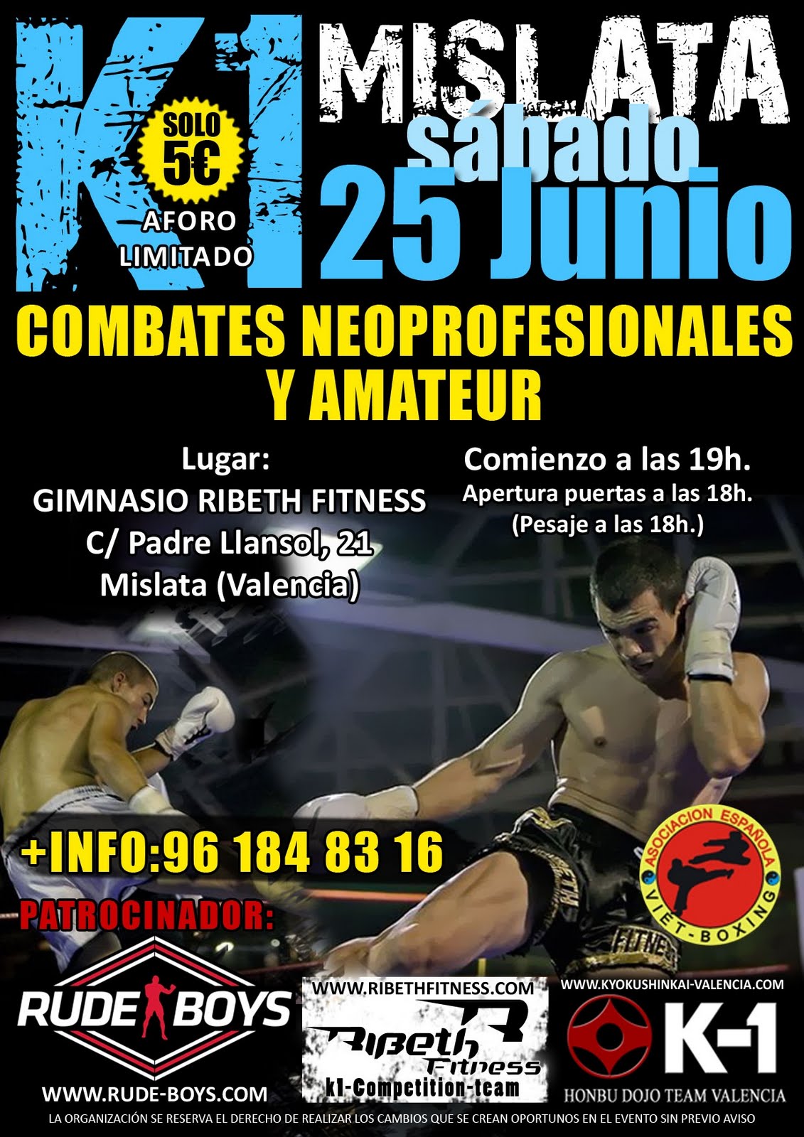 El día 25 de junio Ribeth Fitness vuelve a organizar una velada en las instalaciones, la velada dará comienzo a las 19h. y las puertas abrirán a las 18h. por solo 5€ podrás disfrutar de una tarde amena con buenos combates, esperamos veros a todos un abrazo y gracias.